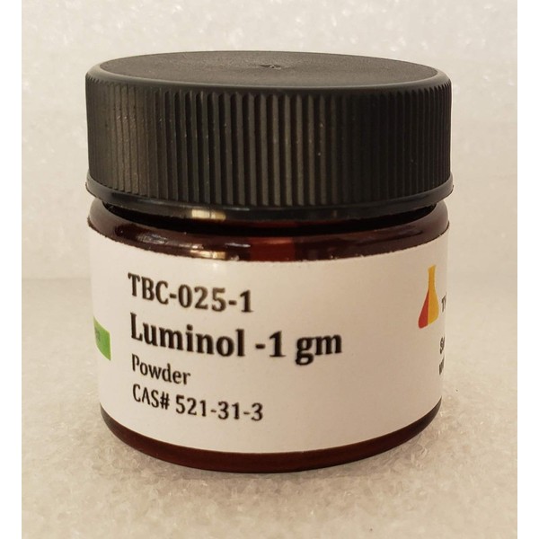 Luminol is a chemical that exhibits chemiluminescence, with a blue glow, when mixed with an appropriate oxidizing agent. It is a white-to-pale-yellow crystalline solid that is soluble in most polar organic solvents, but insoluble in water. This chemical is for Laboratory Use Only. Bottle contains 1g.
