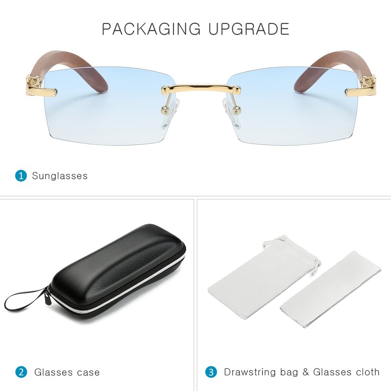 - Chic and new: transparent rectangular sunglasses with rimless frame and a tinted lens. The rimless lenses are combined with transparent candy colours with colour gradient for a simple but refined look. Metal hinges are connected with arms with unique wood grain that make the sunglasses look more stylish and express personality and luxury. The square lens interprets the retro style to better retouch your face shape.