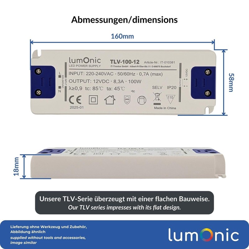 Lumonic I LED Transformer TLV-100-12 I 12 V 100 W I Input 220-240 VAC I Flicker-Free & Ultra Thin I Overload Protection I LED Power Supply I for LED Lighting & LED Light