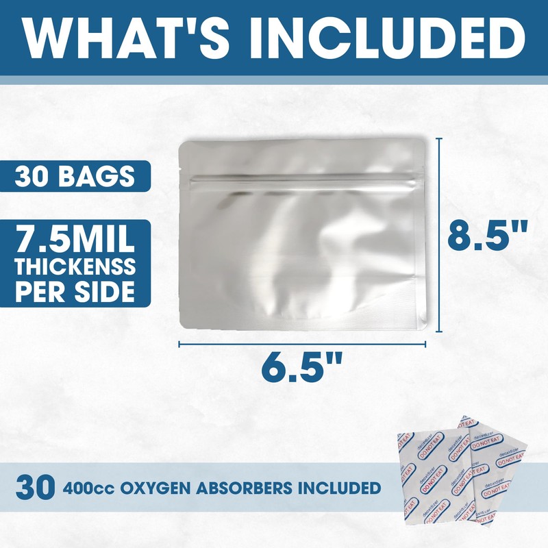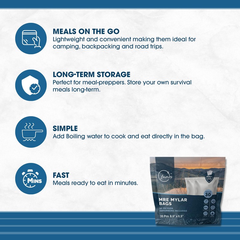 Lumos Products® Mylar Bags 7.5mil PER Side, 30pcs Resealable, Stand-Up, Zip-up, Long Term Food Storage, Ideal for personal Freeze Dried meals, 30pcs MRE/ 30pcs Oxygen Absorbers (MRE)