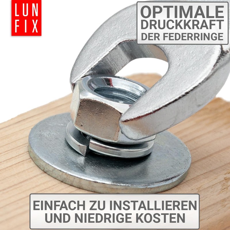 - Corrosion protection: Lun Fix spring washers are covered with a zinc layer, which provides high corrosion protection. This significantly extends its service life under normal humidity and low corrosion influences. Thanks to the use of high-quality galvanised steel, our spring rings are rust and oxidation resistant. However, we recommend that you only use them indoors or in protected outdoor areas.