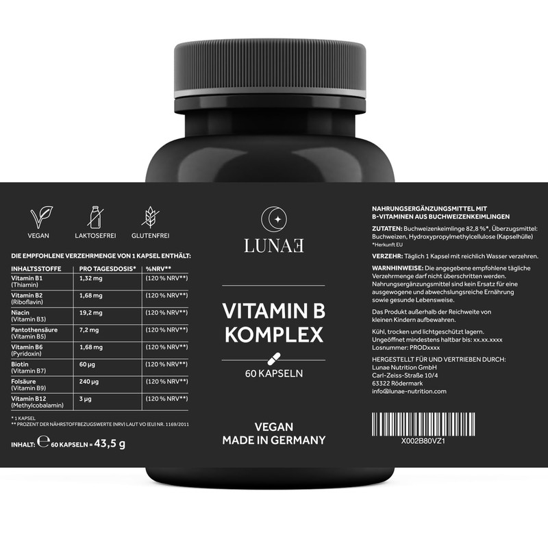 Lunae Lunae Vitamin B Komplex - mit allen 8 B-Vitaminen (B1, B2, B3, B5, B6, B7, B9, B12) - hochdosiertes Vitamin B vegan - laborgeprft & in Deutschland produziert - 60 Kapseln