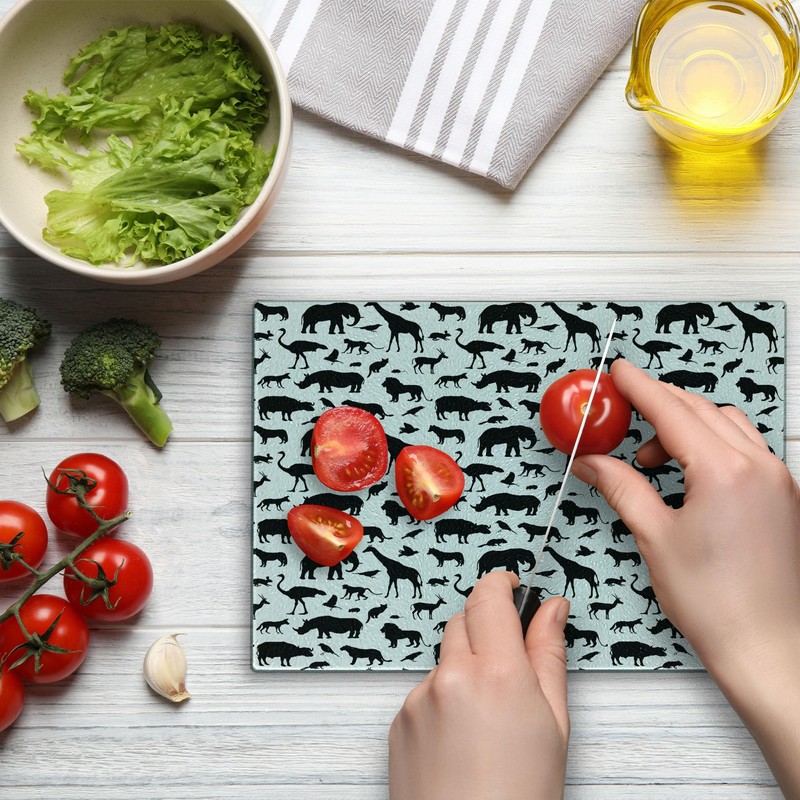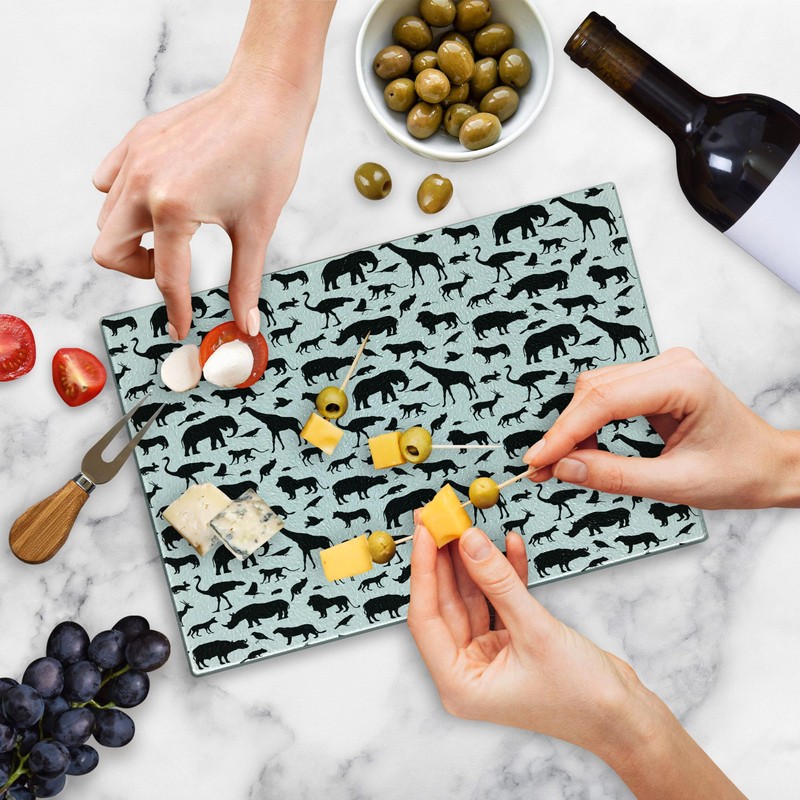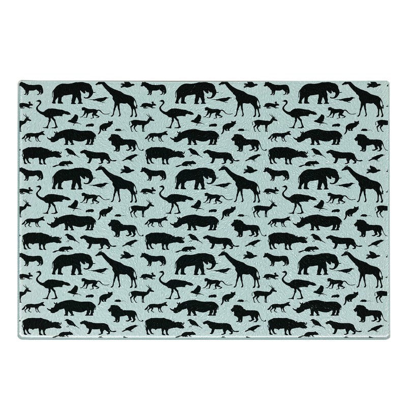 Lunarable Animals Cutting Board, Wildlife Habitat Silhouette Composition Animals as Giraffe Elephant, Decorative Tempered Glass Cutting and Serving Board, Small Size, Black and White
