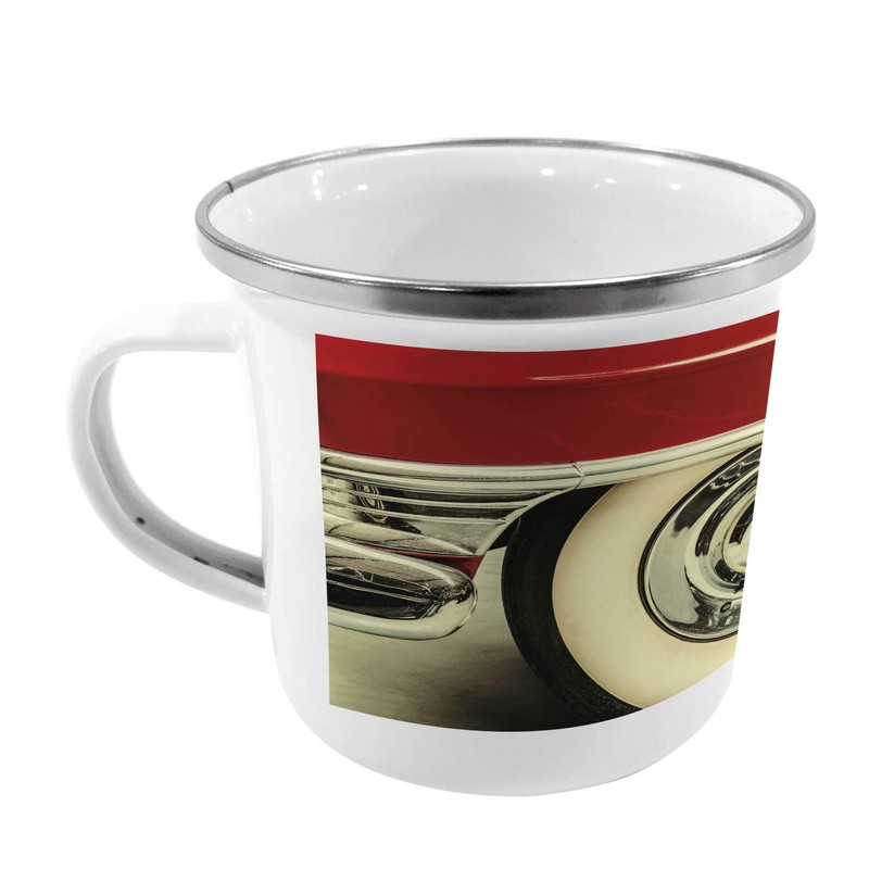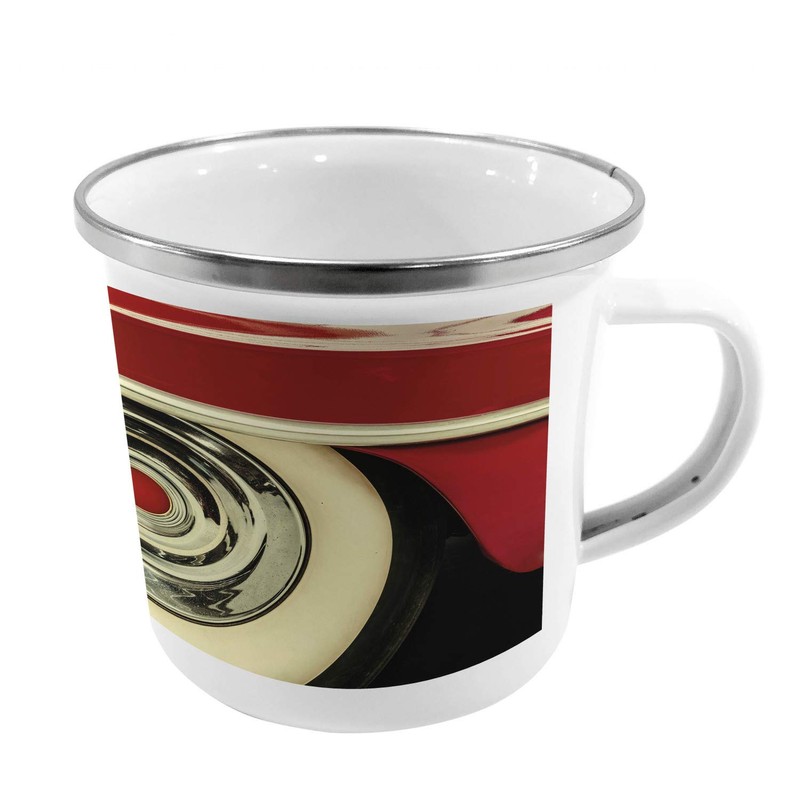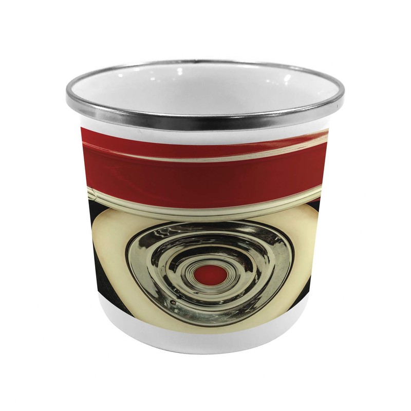 Lunarable Car Steel Camping Mug, Retro Style Wheel of Vintage American Automobile Classic Iconic Picture, Printed Thermal Cup for Camping and Outdoor Activities, Cream Ruby Grey