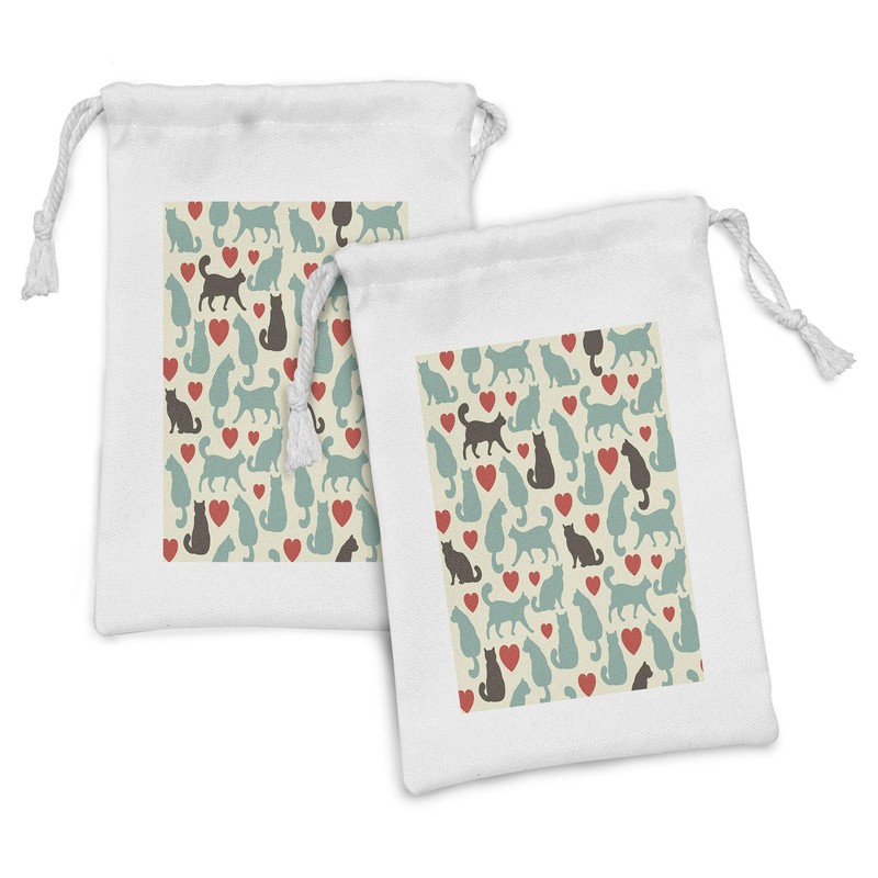 Lunarable Cat Fabric Pouch Set of 2, Pattern with Cats Hearts Happy Walking Shape Kitty Domestic Animal Pets, Small Drawstring Bag for Toiletries Masks and Favors, 9" x 6", Turquoise Red Dark Taupe