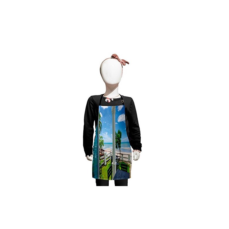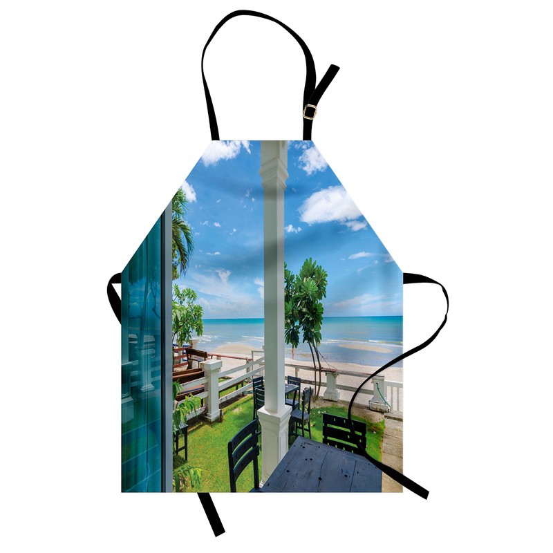 Lunarable Coastal Apron, Outdoor Wood Chairs and Tables by The Sea Trees Greenery Summer Villa Print, Small Apron Bib with Adjustable Ties for Baking Painting, Small Size, Green Blue White