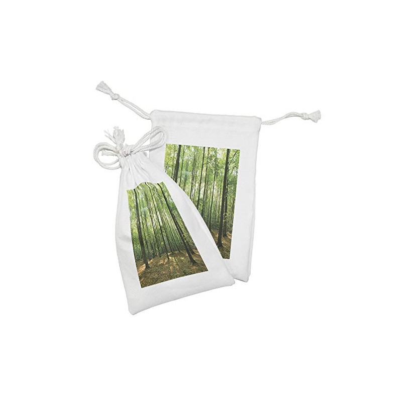Lunarable Forest Fabric Pouch Set of 2, Morning Sun Spring Forest in Sunny Day with Dry Leaves and Branches Image Print, Small Drawstring Bag for Toiletries Masks and Favors, 9" x 6", Green and Brown