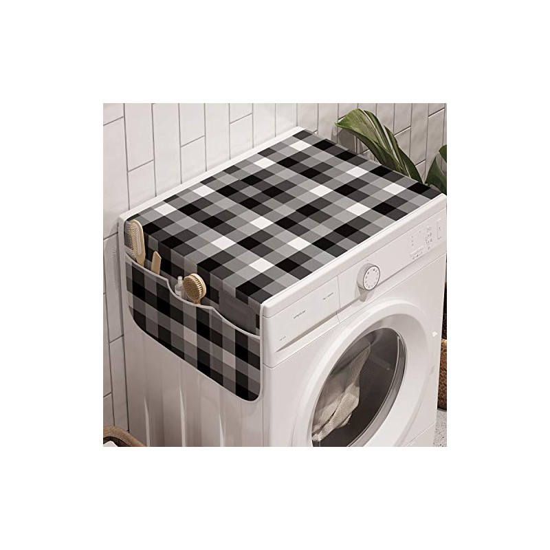 Lunarable Grey Plaid Washing Machine Organizer, Repeating Pattern of Symmetric Squares Greyscale, Anti-slip Fabric Top Cover for Washer Dryer, 47" x 18.5", Dark Grey