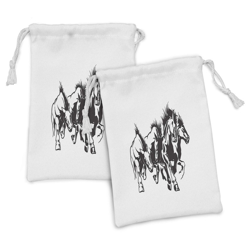 Lunarable Horses Running Fabric Pouch Set of 2, Monochromatic Bold Ink Drawn Illustration of Stampeding Animals, Small Drawstring Bag for Toiletries Masks and Favors, 9" x 6", White and Charcoal Grey