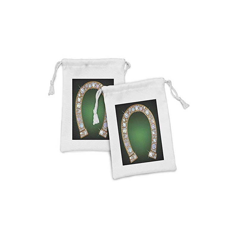 Lunarable Horseshoe Fabric Pouch Set of 2, Horseshoe Design Diamonds Fashion Treasure Crystal Digital Print, Small Drawstring Bag for Toiletries Masks and Favors, 9" x 6", Green Yellow Pearl