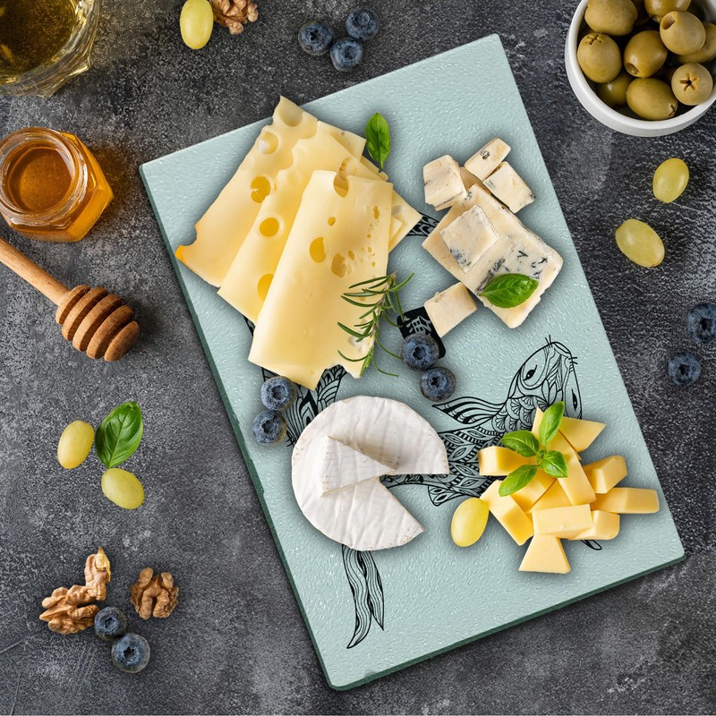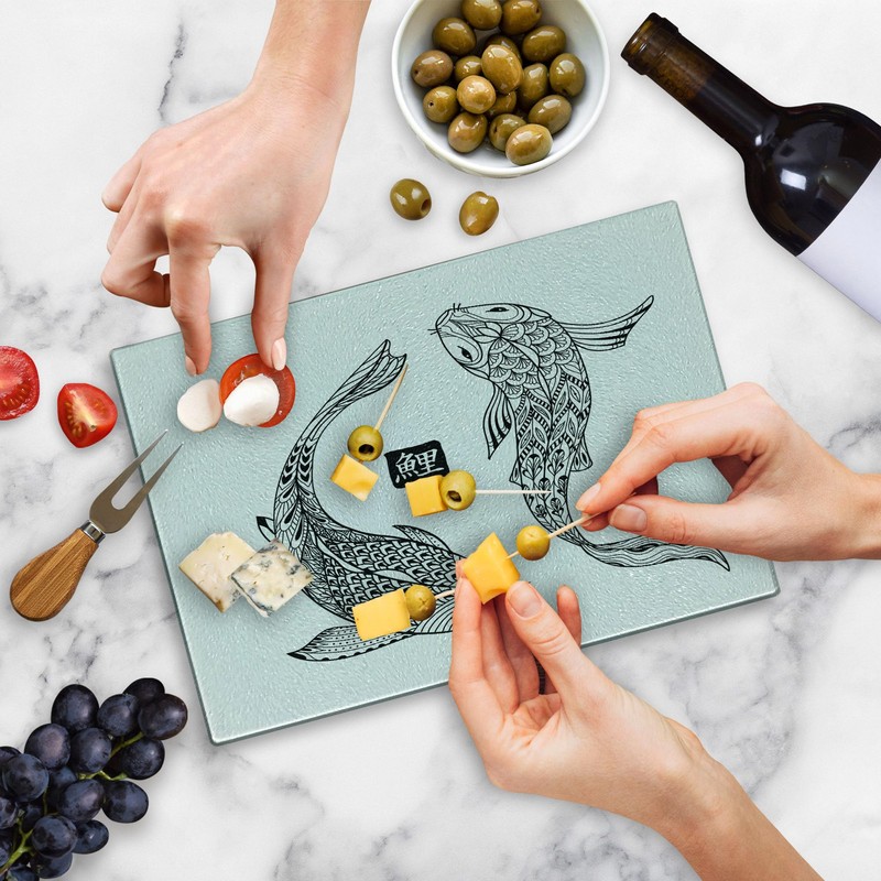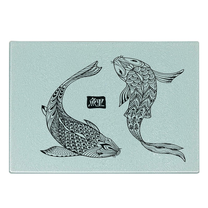 Lunarable Japanese Cutting Board, Pattern of Hand Drawn Koi Fish Carp Outline Yin Yang Eastern Peace Print, Decorative Tempered Glass Cutting and Serving Board, Small Size, Charcoal Grey White
