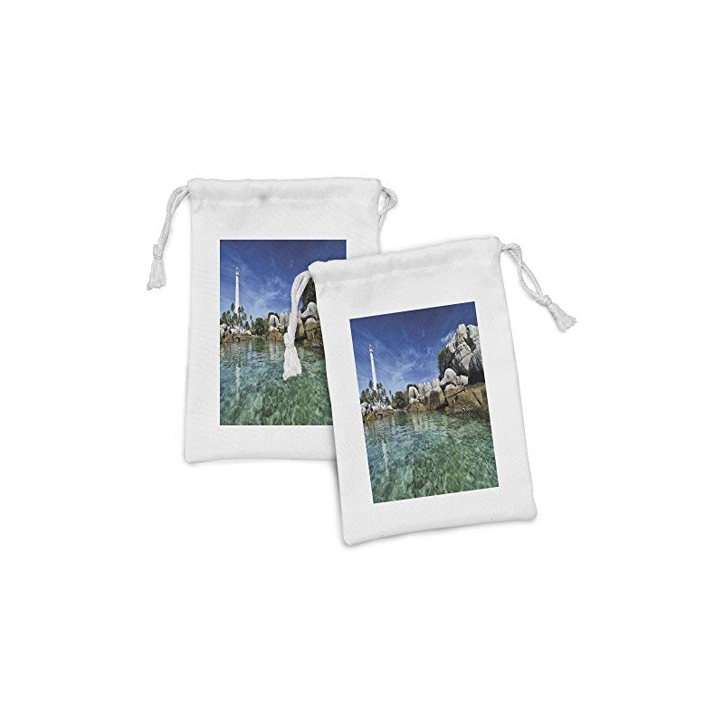 Lunarable Lighthouse Fabric Pouch Set of 2, Lighthouse Clear Water Palm Trees Summer Sky Rocky Shoreline Seascape, Small Drawstring Bag for Toiletries Masks and Favors, 9" x 6", Teal Blue Grey