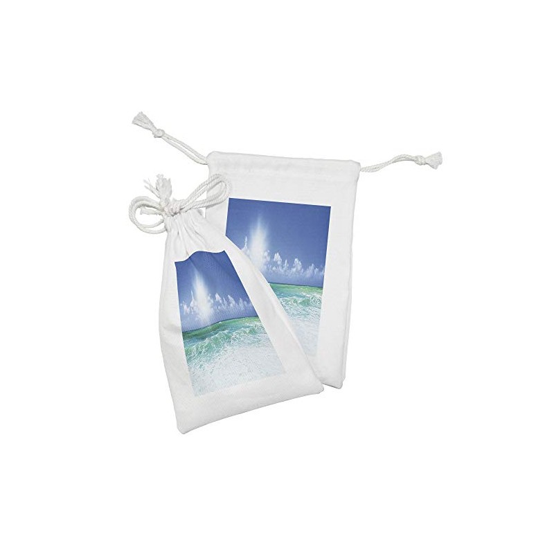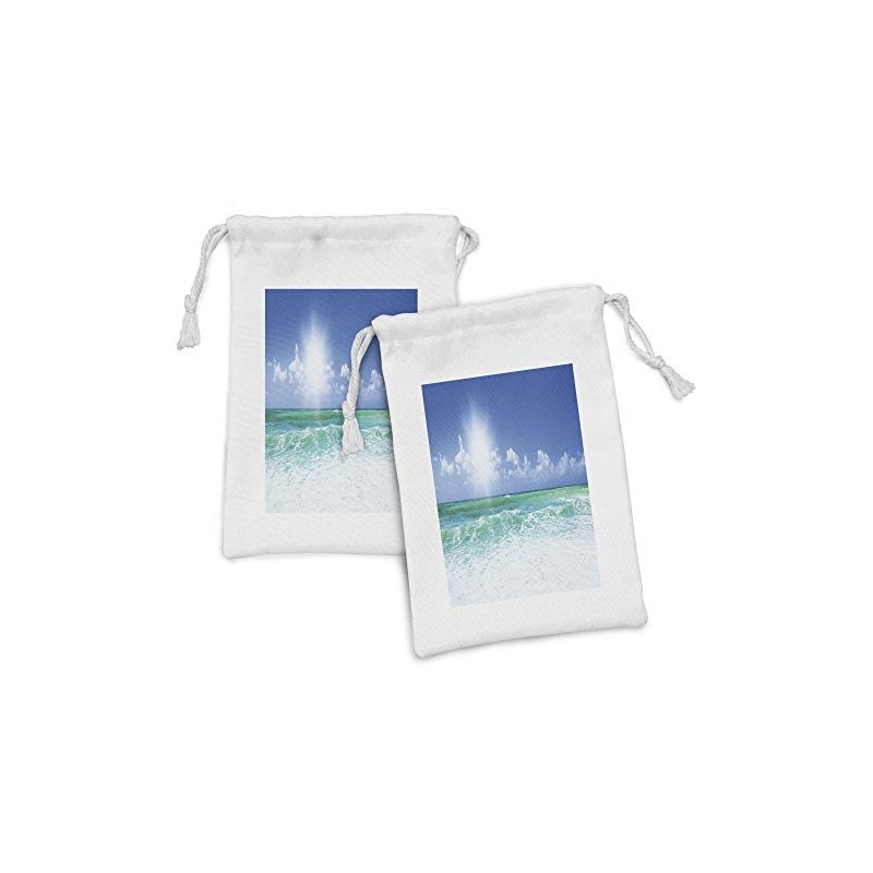 Lunarable Ocean Fabric Pouch Set of 2, Sky and Beach Waves Panoramic Photo Tropical Summer, Small Drawstring Bag for Toiletries Masks and Favors, 9" x 6", Dark Seafoam Azure Blue