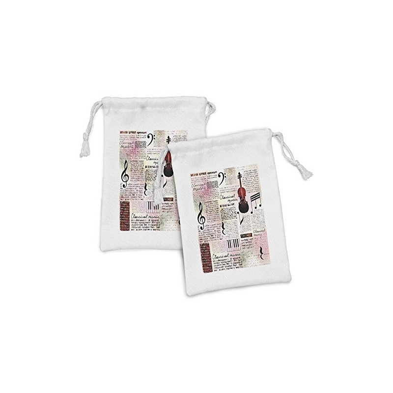 Lunarable Old Newspaper Fabric Pouch Set of 2, Classical Music Theme Instruments Piano Violin Notes Art, Small Drawstring Bag for Toiletries Masks and Favors, 9" x 6", Ruby Pale Pink Black