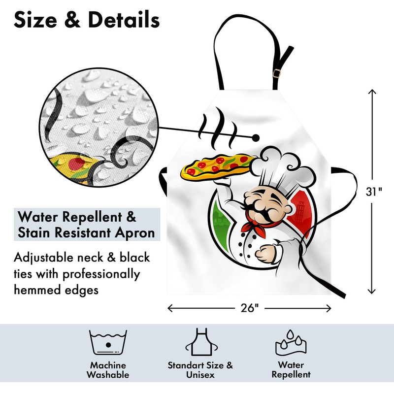 Lunarable Pizza Apron, Cartoon Design Italian Chef with Mustache and Clouds in Flag Colored Round Print, Unisex Kitchen Bib Apron with Adjustable Neck for Cooking Baking Gardening, Green Red