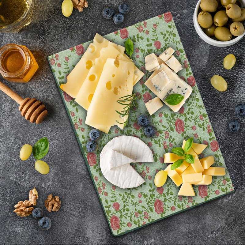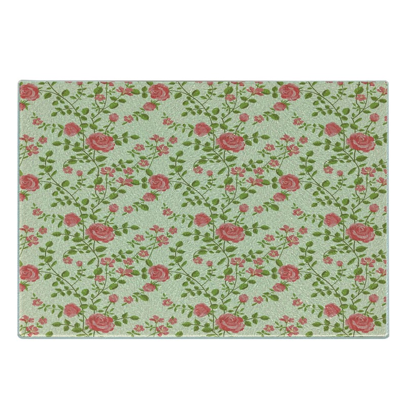 Lunarable Roses Cutting Board, Valentines Day Themed Flowering Branches Romantic Natural Scenes Feminine Themes, Decorative Tempered Glass Cutting and Serving Board, Small Size, Green Coral