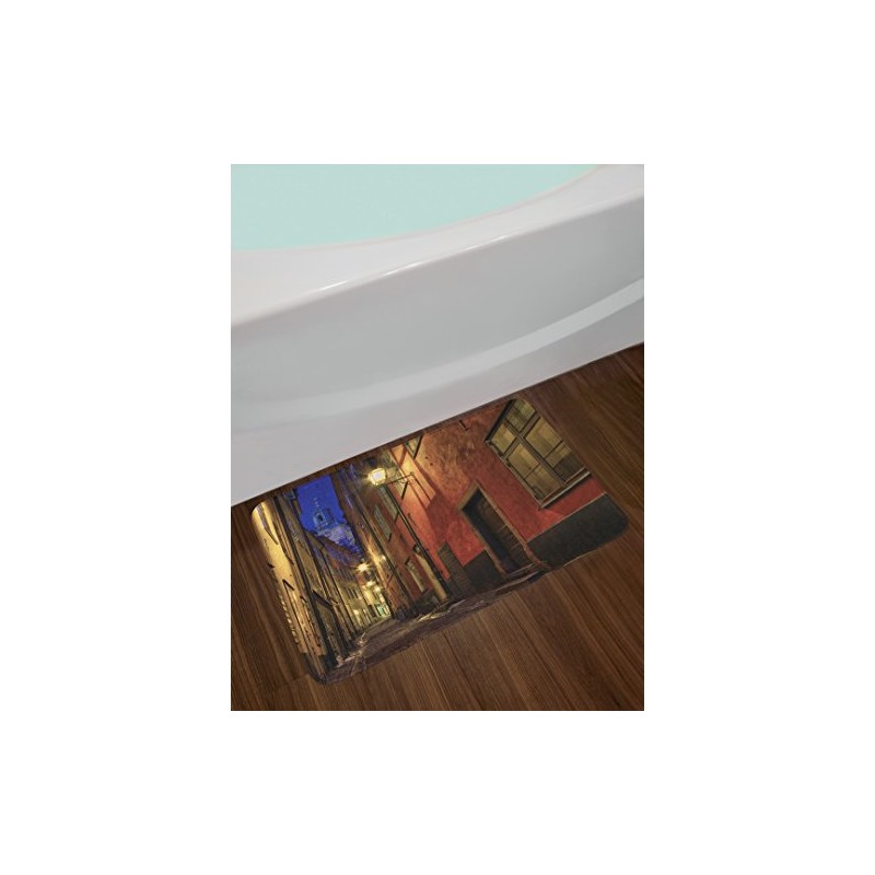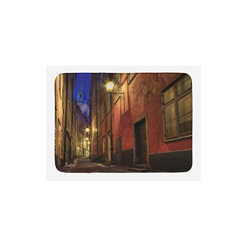 Lunarable Scenery Art Bath Mat, Night in The Alley in Old Town Stockholm Tower Darkness Image Print, Plush Bathroom Decor Mat with Non Slip Backing, 30.2" x 20", Dark Coral and Brown