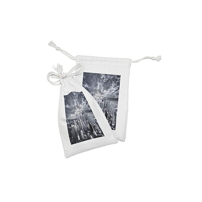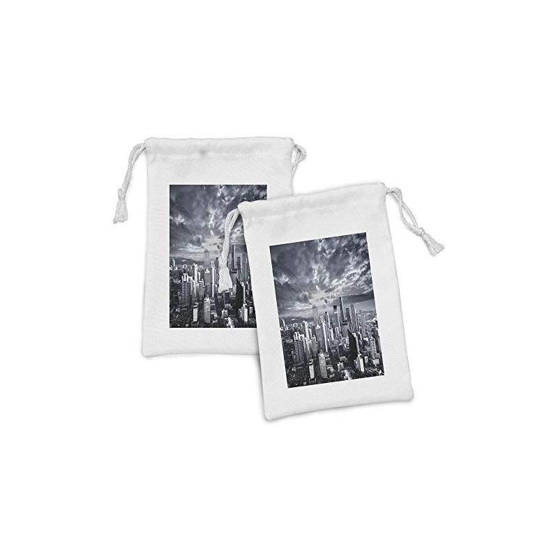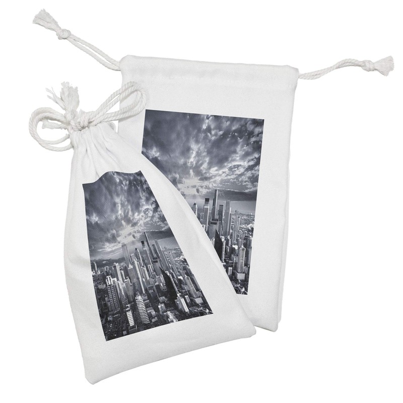 Lunarable Scenery Print Fabric Pouch Set of 2, Seattle Cityscape Business Buildings Skylines Dark Clouds at Sunset Look Print, Small Drawstring Bag for Toiletries Masks and Favors, 9" x 6", Grey