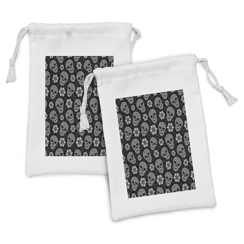 Lunarable Skull Fabric Pouch Set of 2, Monochrome Heart Shapes with Floral Composition Gothic Inspirations Halloween, Small Drawstring Bag for Toiletries Masks and Favors, 9" x 6", Black and White