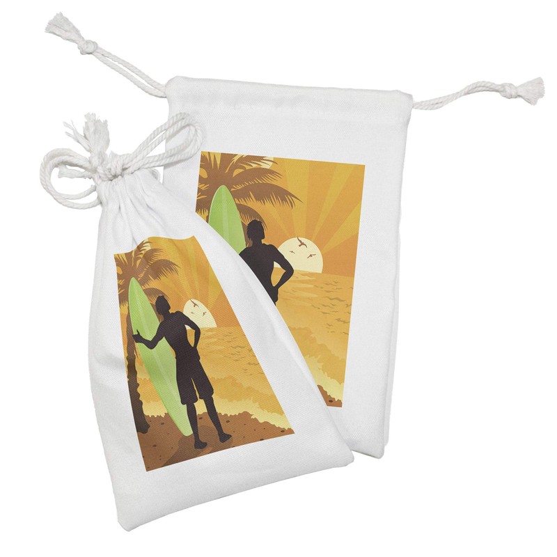 Lunarable Surfing Fabric Pouch Set of 2, A Surfer on Sandy Beach Surfboard Looking to the Sunset Sky Sea, Small Drawstring Bag for Toiletries Masks and Favors, 9" x 6", Orange Caramel and Lime Green