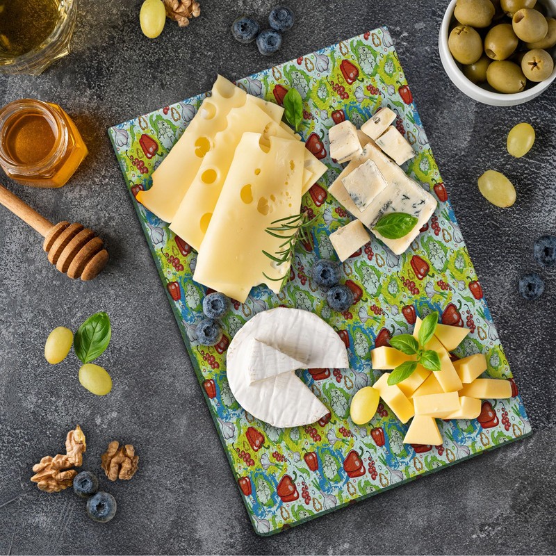 Lunarable Vegetables Cutting Board, Ornate Food Garlic Pepper Cauliflower Delicious Plants Image, Decorative Tempered Glass Cutting and Serving Board, Small Size, Yellow Red Lime Green Pearl