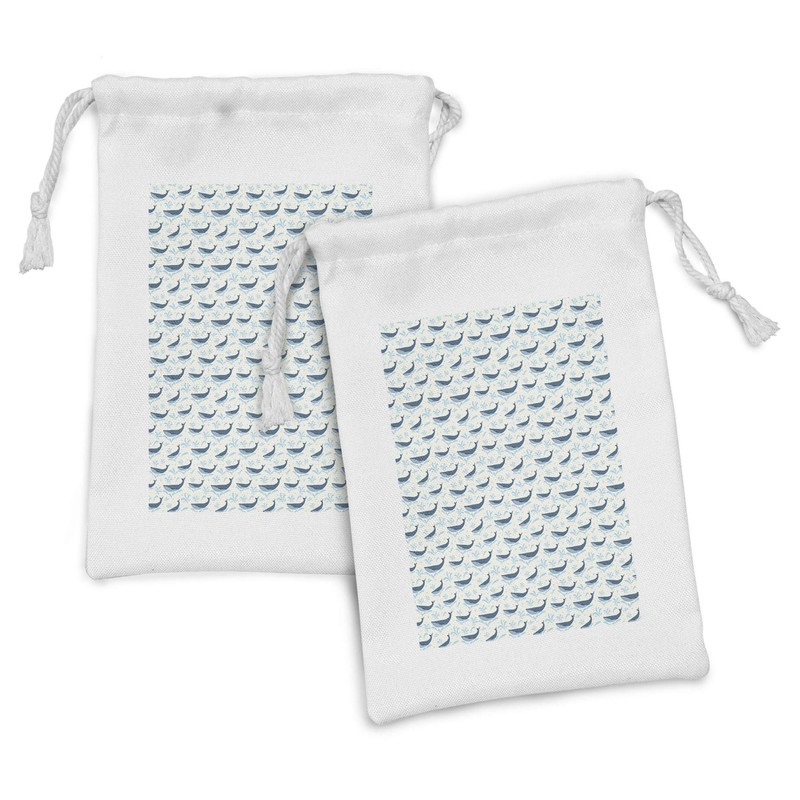 Lunarable Whale Fabric Pouch Set of 2, Swimming Whales Spouting Water Childish Wild Animals Nautical Print, Small Drawstring Bag for Toiletries Masks and Favors, 9" x 6", Blue Grey Pale Blue