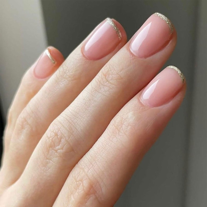 LunarCharm 24 Pieces Short Square Press-On Nails, Pink False Nails with French Tips and Glitter Designs Featuring Golden Edges, Short Thick Natural Press-On Nails