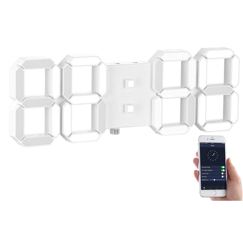- Extra large time display with 37 cm width Also displays the room temperature Alarm clock with 2 adjustable alarm times Dimmable brightness For standing up and hanging Setting via free app