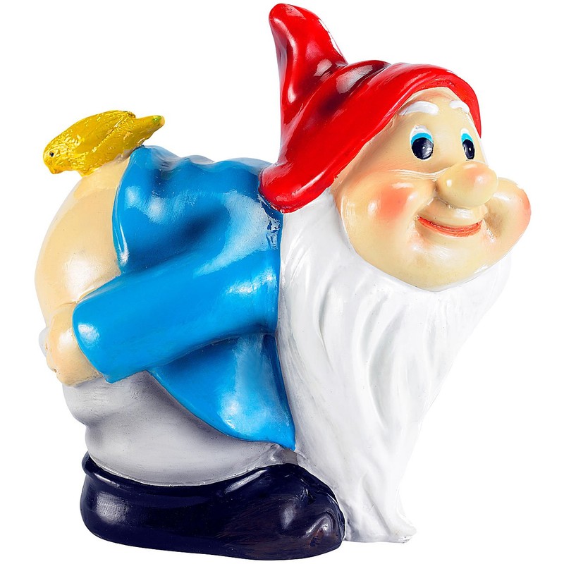 - Small, cheeky, funny: cute decorative gnome for windowsill and garden A funny eye-catcher is the curious yellow bird on his back Made of weatherproof polyester resin Suitable for temperatures from -20 °C to + 40 °C Especially beautifully painted in bright colours