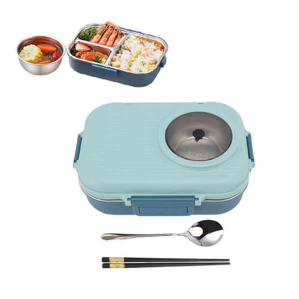 Lunch Box, 1100ml Double Layer 3 Grid Design, 304 Stainless Steel Thermal Lunch Box with Chopsticks Spoon Soup Bowl, Food Container for Kids Students Adults(Blue)