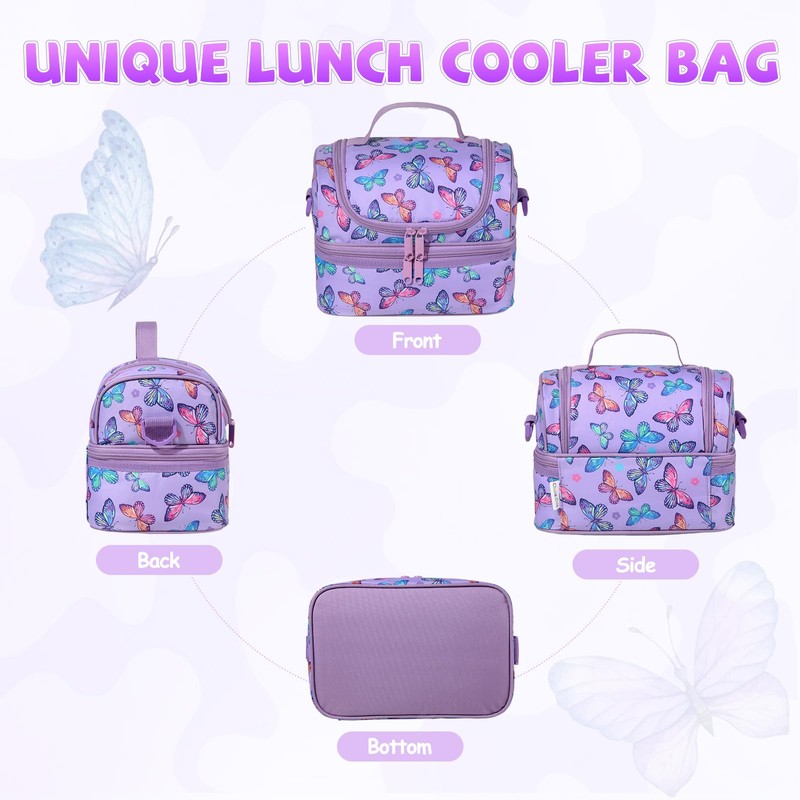 Lunch Tasche Kinder,ChaseChic Wiederverwendbar Leicht Isolierte Lunchboxen Auslaufsicher Kühltasche im Dual Abteil mit Abnehmbar Einstellbar Schulterriemen Violette Schmetterlinge