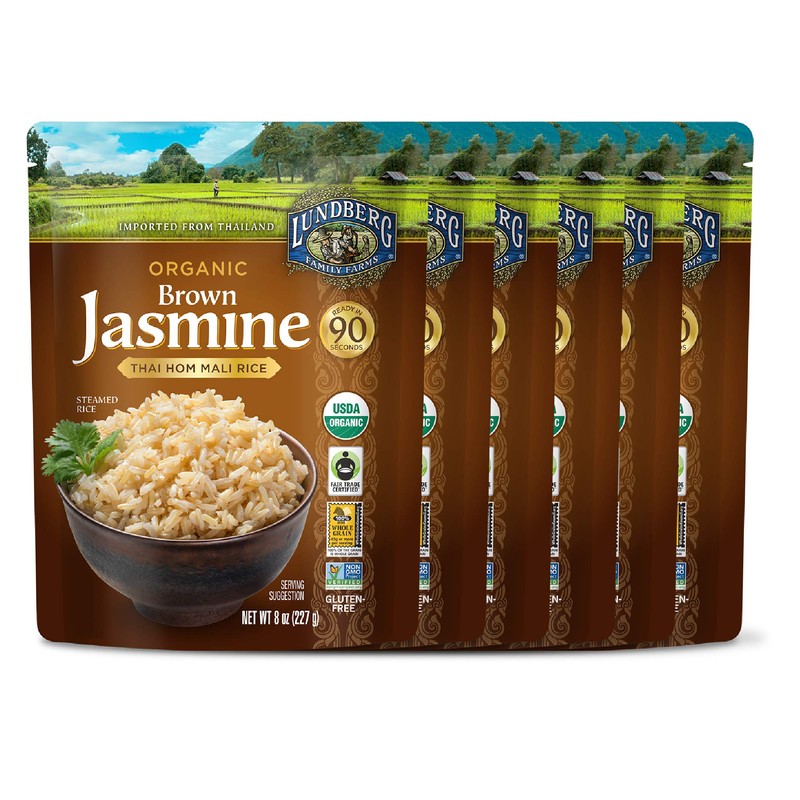 Lundberg Family Farms - Organic Brown Jasmine Thai Hom Mali Rice, Ready to Heat Steamed Rice, 90 Second Prep Time, 100% Whole Grain, Non-GMO, Gluten-Free, USDA Certified Organic, Vegan (8 oz, 6-Pack)