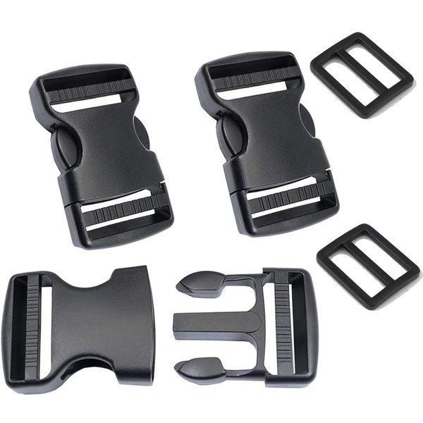 Because the male and female side of the plastic buckle both have two slots to pass through the strap.MULTIFUNCTIONAL:The 1 inch quick release buckles are for 1 inch long nylon webbing, perfect for replacing and fixing the belt buckle or the belt buckle or broken buckle on the backpack strap, belly belt and dog collars, waist belt, hiking backpack, etc. The buckles are very stable and durable, with high tensile strength, which gives it a very good load capacity. Size and contents – the buckle with side release is suitable for strap widths from 21 mm to a maximum of 25 mm. The strap is adjustable on one side of the click closure.