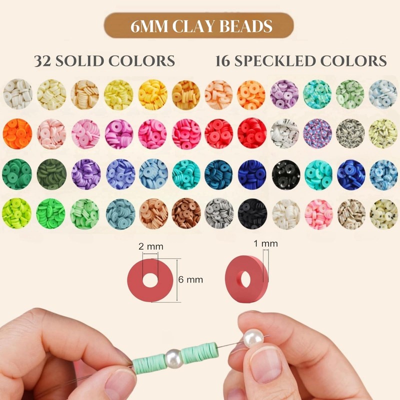 - Package Contains: More than 10,800 beads in total, including 48-color 9600pcs 6mm clay beads, 1120pcs bead assortments like letter beads, happy Beads beads, pearl beads, spacer beads, heart beads, pendants, and jewelry-making accessories.