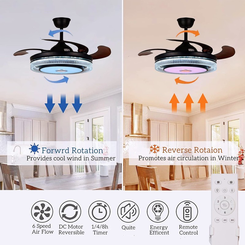 - đăReversible Silent Motoră: The ceiling fan uses high quality pure copper coil motor for stable operation and low noise design without affecting the sound of music. Can be set to run forward (for summer cooling) or reverse (for winter ventilation).