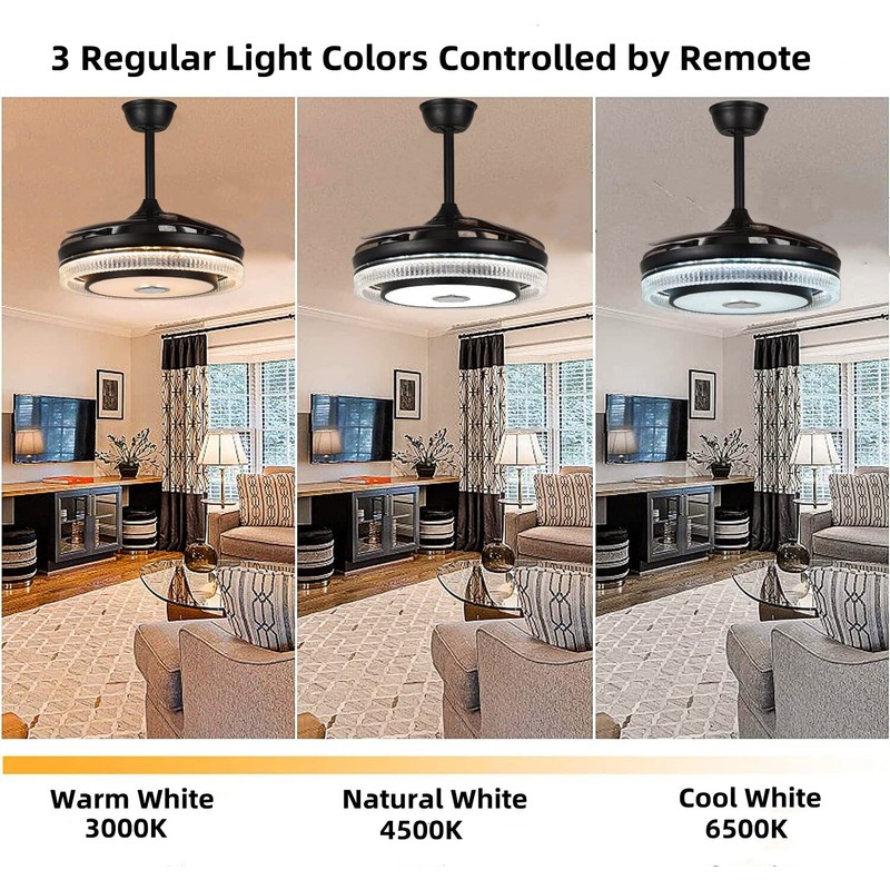 Remote control: 6 fan speed( low/medium/high), 3 regular color( warm white 3000K, neutral white 4500K to cool white 6500K)
