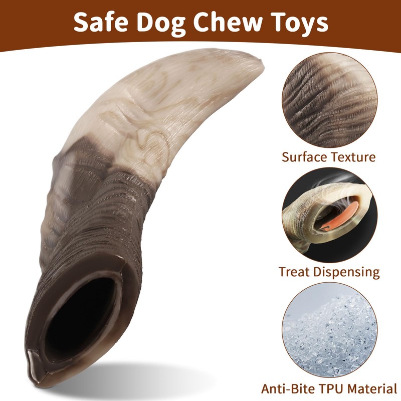 - Unique Design: Unique cow horn shape and realistic texture. With the hollow design of this toy, you can put some snacks, such as dog food, freeze-dried, etc. to attract your dog's attention, which can stimulate your dog's intelligence, maintain a reasonable diet, and increase your dog's playfulness.