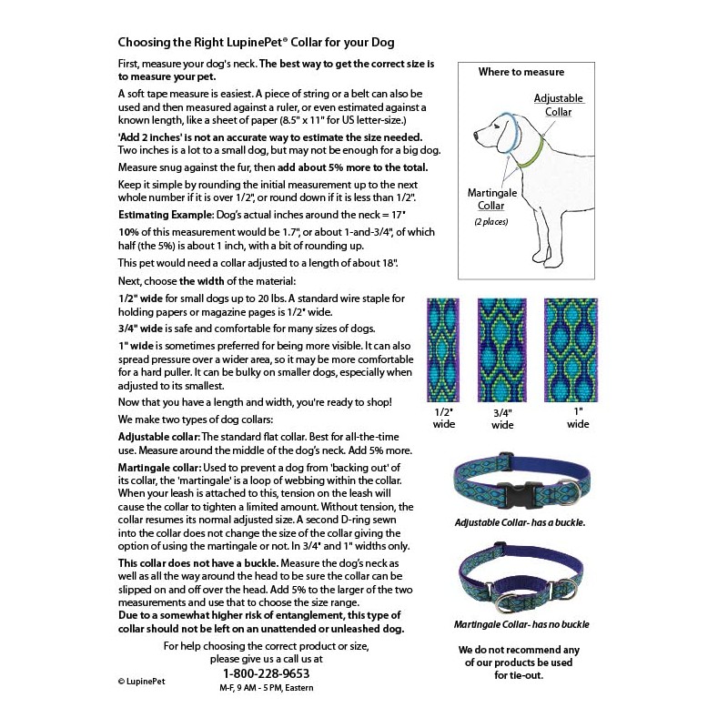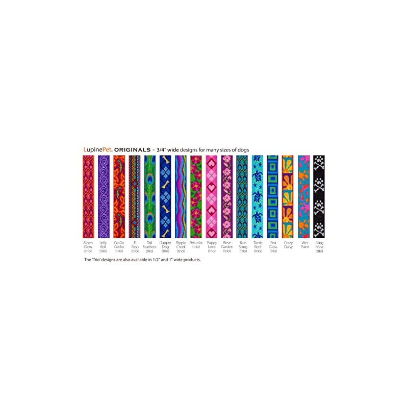 Lupine Originals are offered in many different designs and colors to compliment your pet's coat-color and personality. Jacquard-woven nylon has the design woven into the webbing, rather than printed or sewn on. Products are made with strong bar-tack stitching and welded steel hardware, and the ends of the material are turned under and stitched to protect fur and skin.