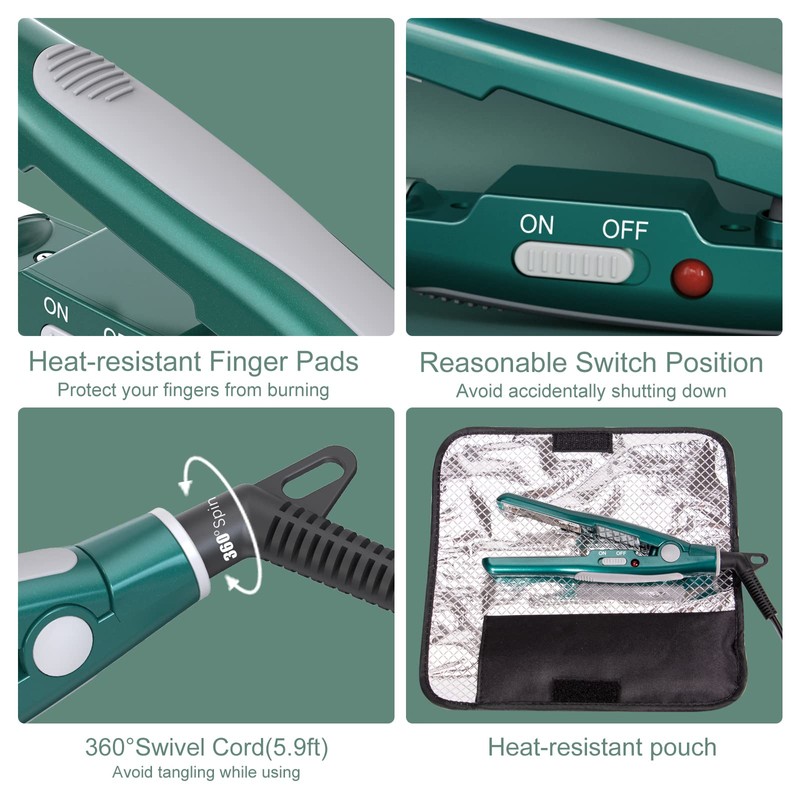 - Heat Resint Design To Protect your fingers from burning while using,we specially designed a heat-resistant silicone pad on the top of the handle.In addition,Our travel hair straighteneres with a Heat-resistant pouch,which allow you to pack it an immediately without worrying about it daging belongings after using it.