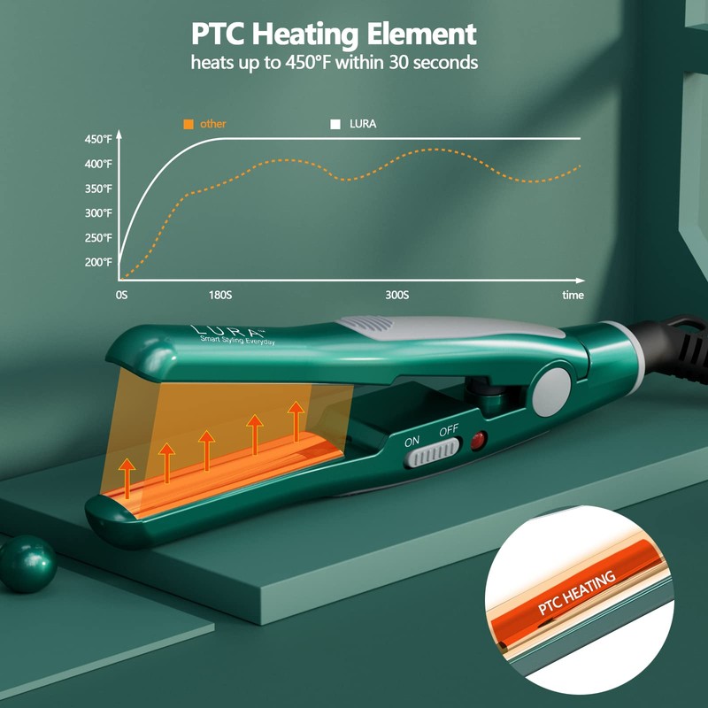 - Heat Up Quickly LURA mini hair straightener with PTC heating element can be heated up to 450 F within 30 seconds and provides stable temperature, which greatly improves the styling efficiency and reduces thermal damage.