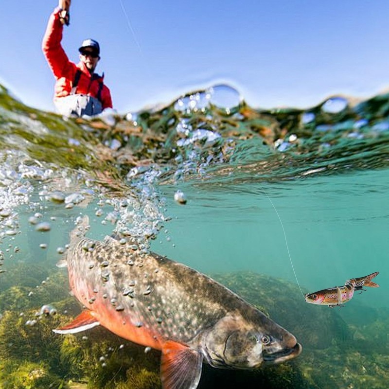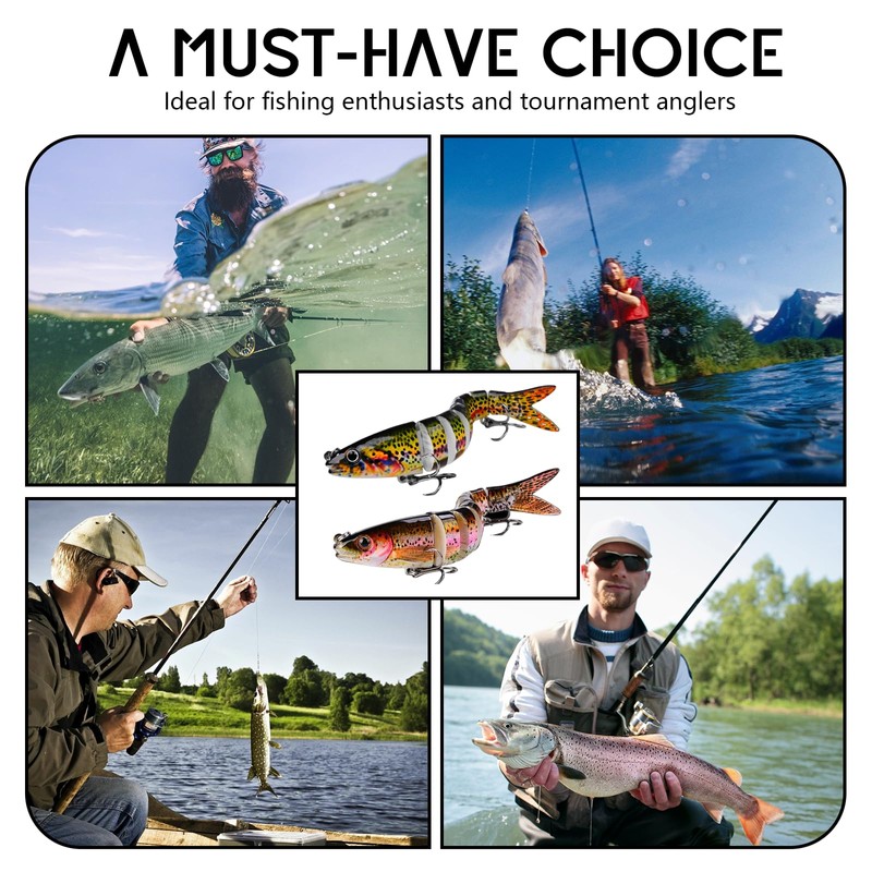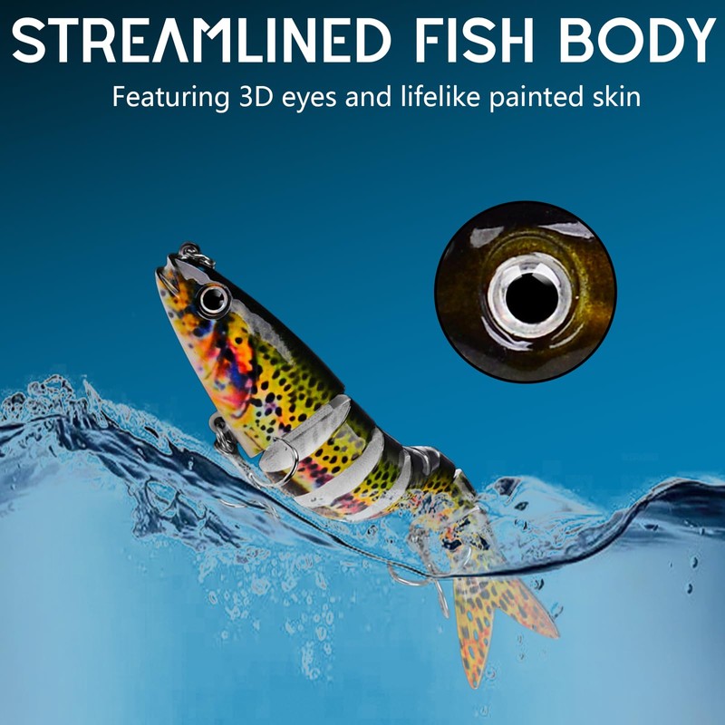 - Unique design: bait fish fishing set has an 8-segment bait body design, multiple bionic swimming methods that can sink slowly and move flexibly in the water, a 3D simulated fish eye design that attracts more fish and stimulates the attack of predatory fish