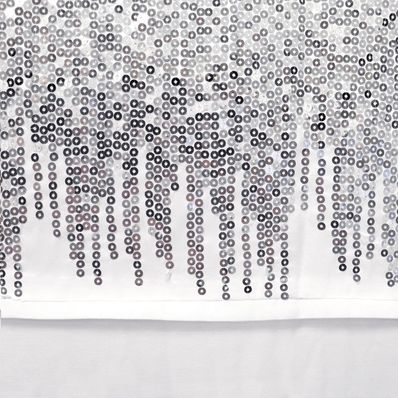 - White fabric shower curtain with shimmery stripes of sequins at the top and bottom of the curtain.