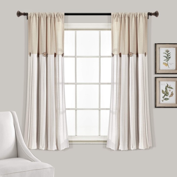 Lush Decor Linen Button Window Curtain Panel, Single, 40" W x 63" L, Linen - Country Curtains - Rustic Decor - Color Block Modern Farmhouse Curtains For Living Room, Bedroom & Dining Room