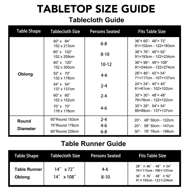 - LUSHVIDA Tablecloth Size Guide: Please measure your table size before purchase and calculate the proper size for a round or rectangular table. The available sizes are: table runner 14 x 72 inch; table runner 14 x 108 inch; Square 54x54 inch; Square 60x60 inch; Square 70x70 inch; rectangle 52 x 70 inch; rectangle 60 x 84 inch; rectangle 60 x 102 inch; rectangle 60 x 120 inch; round 60 inch; round 70 inch; round 90 inch.