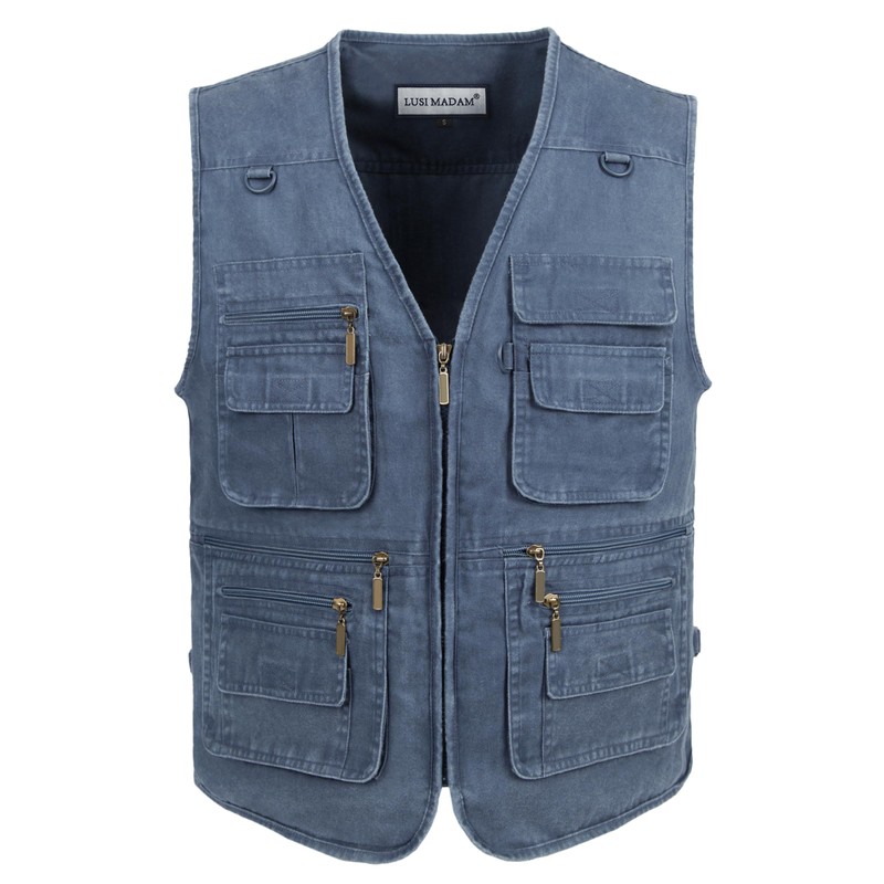 LUSI MADAM Men's Stone Washed Denim Multi-pocketed Fishing Work Outerwear Vest Medium Blue