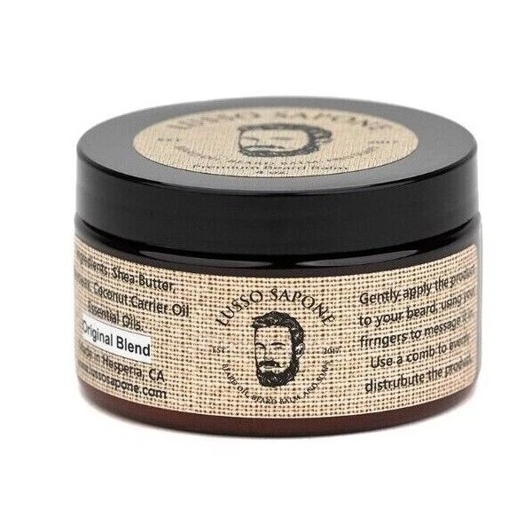 Lusso Sapone beard balm is made up of shea butter, carrier oils, and essential oils along with a little wax. Its purpose is to help keep beard hair soft and healthy, provide very slight control over the beard, and it will generally add a little shine. Beard oil should be used with beard balm as well as the beard oil will moisturize the skin and roots, while the beard balm will soften and care for the longer parts of the beard.