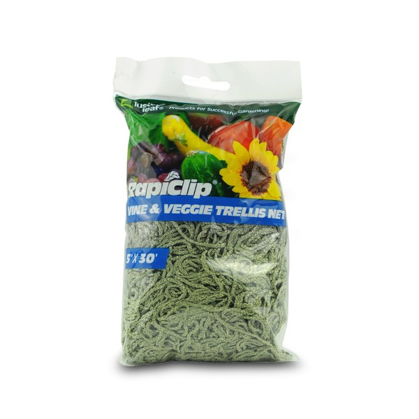 The Vine and Veggie Trellis from rapiclip is a soft material ideal for use with climbing plants of any kind. It's unique, green color allows it to blend in with it's surroundings. 5.25 squares allow for easy harvesting. It also has tie offs along both sides for easy tying onto stakes or supports. Available in 5'x10', 5'x30' and 5'x60'.