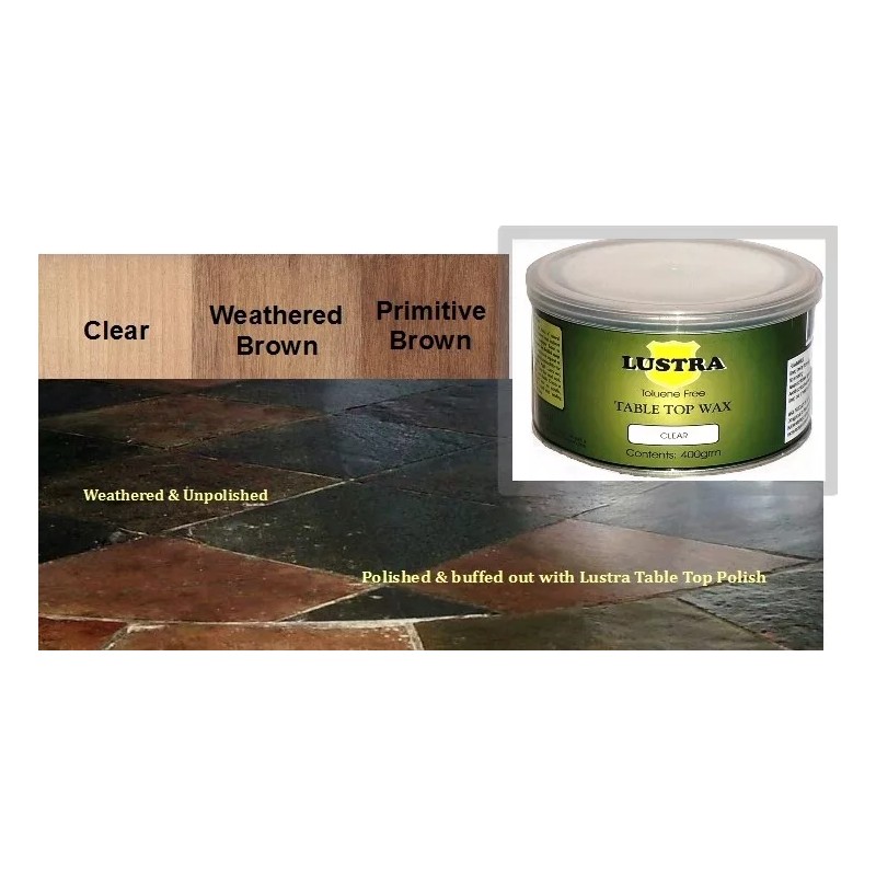 We are active sellers both on and off the web. Feedback is time consuming, and an important part of both buying and selling. It is our policy that on receiving positive feedback, we will reciprocate. Please send us an email that you have left feedback, and we will respond in kind ASAP.Lustra Table Top Wax, unlike wood and antique care polishes like Briwax, is a high solids wax polish specially formulated to be used interior or exterior where resistance to water is important, such as walls, wainscoting, kitchen cabinetry, kitchen and patio table tops. Lustra Table Top Wax is particularly effective on country antiques and reproductions used in and around the kitchen and where wiping with a damp cloth is necessary, producing a low luster shine that enhances the aesthetic qualities of the substrate to which it is applied.Lustra Table Top Wax is ideal as a seasonal pick me up to patio furniture pieces, including patio table tops of slate, terracotta and various stone types.