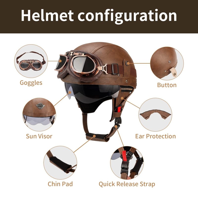 - Material: Retro motorcycle half helmet is made of high quality PU leather. high strength, can effectively absorb external shock, reduce the impact on the head, and effectively protect the safety of the head. The inner lens can be zoomed freely, move the switch, the lens can be stored, pull the switch down, the lens can be opened. Detachable ear protection so you can wear it in cold winter weather.