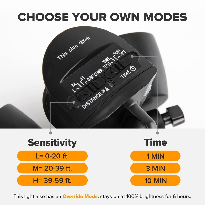 - 【4 LIGHTING MODES】Test Mode, Security Mode, Dusk to Dawn Mode and Manual Override Mode. Manual override mode allows light to operate constantly for selected period of time. More choices can meet different demand for each customer. Choose the most appropriate mode for your needs and desires.